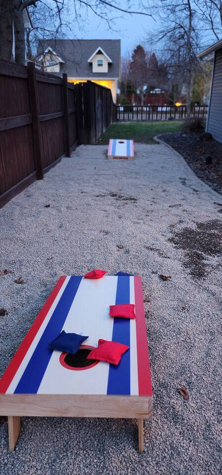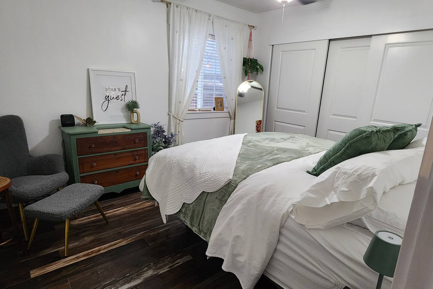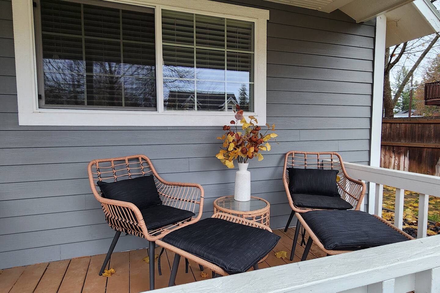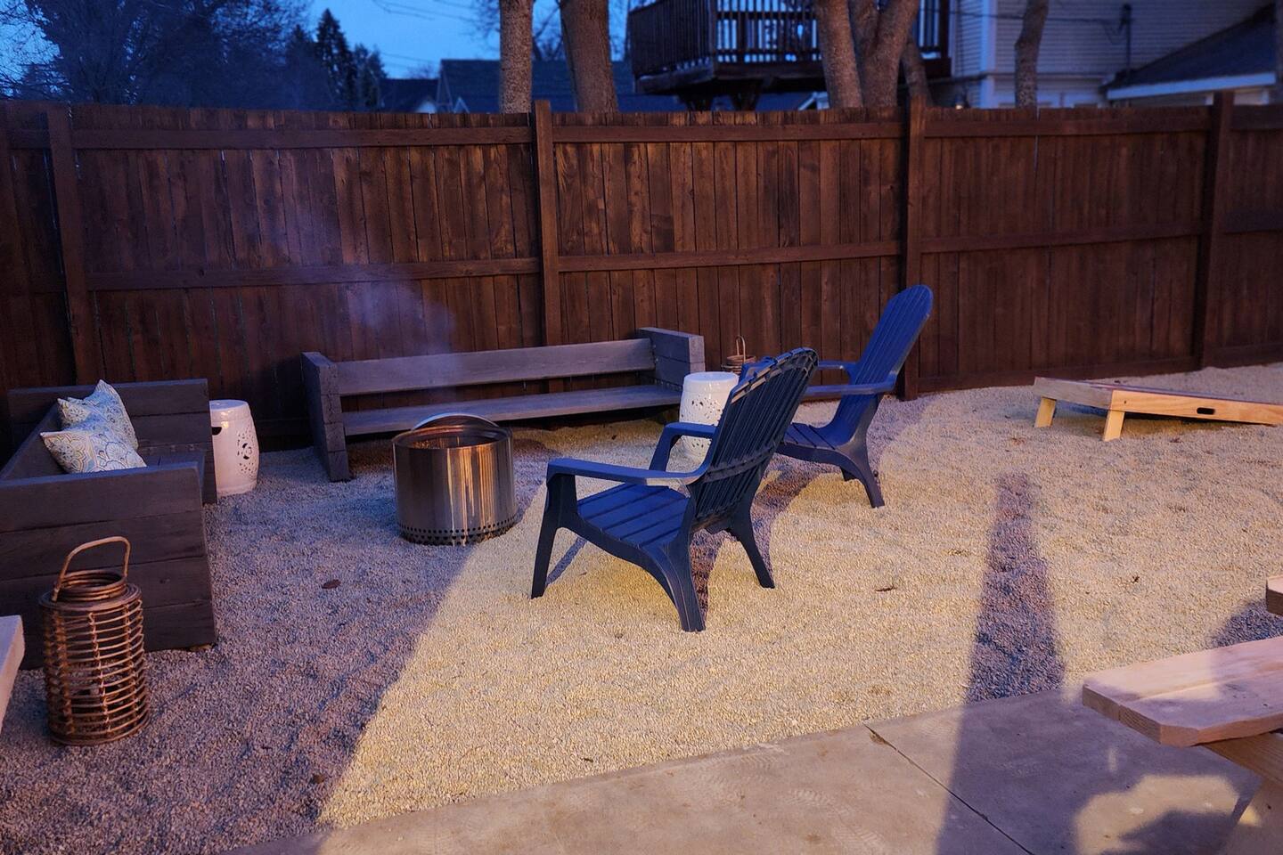 Complimentary gift basket upon arrival This adorable updated 1905 home is set back from the street on a large, fully fenced lot, with mature trees for your family and furry friends! Inviting and large front porch, private back yard (6’ fence), paved back patio with fire pit for those cooler nights and smores with the kids. Summer vibes enjoying a cookout and games of cornhole. Bikes are also provided in the spring, as well as off the street parking in the back. The meticulously clean interior boasts a large sectional, 65" Smart TV & soundbar, with live TV, and streaming through your accounts for all your movie and music needs, complete with popcorn machine, games for kids and adults. - decorated to ensure you feel at home. Your comfort and rest are of utmost importance to us and we have taken extra measures in both bedrooms. You will find new, comfortable mattresses, pillows and luxury linens to pamper you. Furthermore, the rooms are each adorned with soft, warming amenities such as extra pillows, throw pillows, reading lamps, charging stations, and a sound machine allowing you to snuggle up to a good book, catch up on emails, or simply rest. The second bedroom also has a Smart TV to keep the movie buffs, gamers and kids entertained. The bathroom boasts a new walk-in shower, big fluffy bath towels and a heated floor for soothing comfort on colder mornings. The updated kitchen has granite countertops and all the amenities; gas range, coffee bar, ice machine, toaster, air fryer, stainless cookware, smoothie blender, kettle, wine glasses, storage containers, snack, serving and baking dishes. Table setting for six. COMPLIMENTARY SNACKS, TEA & HOT CHOCOLATE! - Ultra Fast Wi-fi @ 450Mbps - Full Laundry set-up with ironing board and steamer - Dedicated private workspace BEDROOM 1 - King bed - extra pillows - throw blankets - 43 ' smart tv - charging station - dresser - large closet - reading space - full length mirror - hangers BEDROOM 2 - Queen bed - bunk bed twin - futon bed - 43 ' smart tv - hangers - dresser - closet - games & books - charging station *available to use our black out window coverings and sound machine Bathroom New tiled walk-in shower - shampoo, conditioner & body wash - heated tile floor - bath towels - hairdryer - first aid kit Security Cameras Present: - Ring Doorbell Camera at the front entrance. - Ring camera monitoring the parking area at the rear of the property. - The private back yard is NOT monitored and is outside the field of view of any cameras. Please note: The primary person booking the property must stay at the property (no third-party bookings) Thank you!